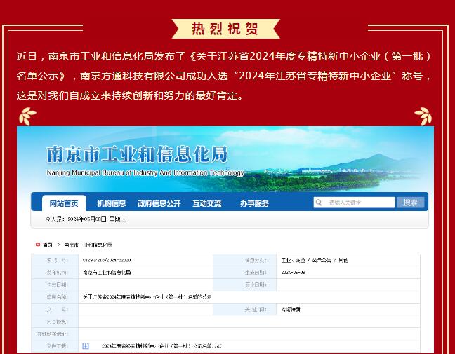 喜報|專(zhuān)注鑄專(zhuān)業(yè),精益求效益,南京方通科技有限公司成功入選江蘇省2024年度專(zhuān)精特新中小企業(yè)(第一批